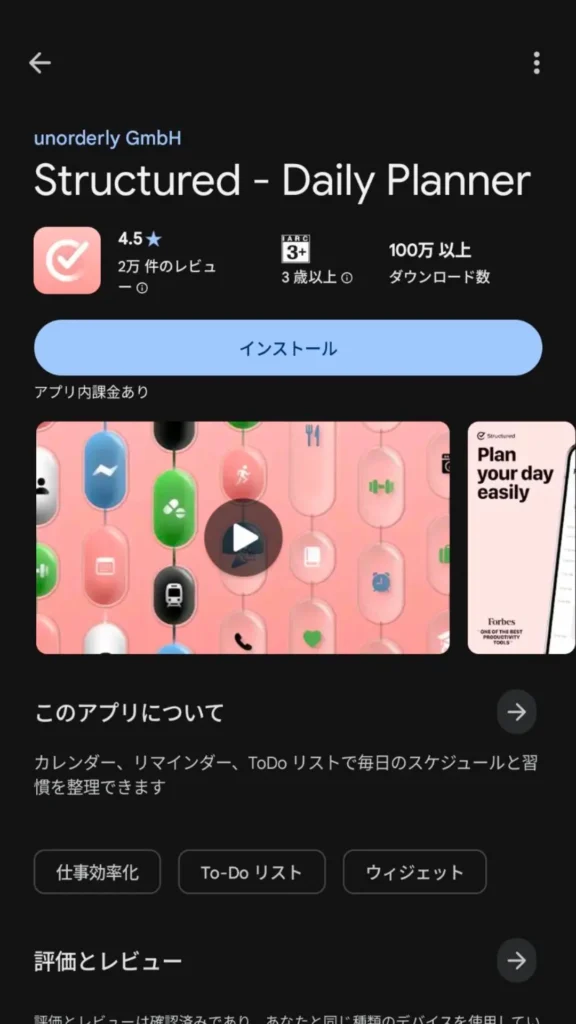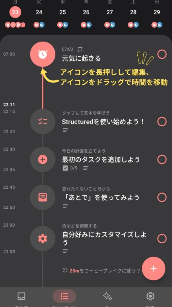 Structuredは無料プランでも、タイムラインビュー・タスク登録・リマインダーといった基本機能が使えます。